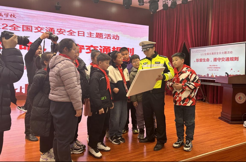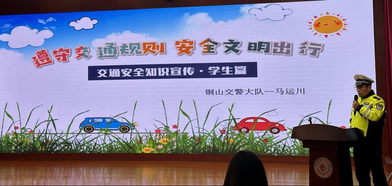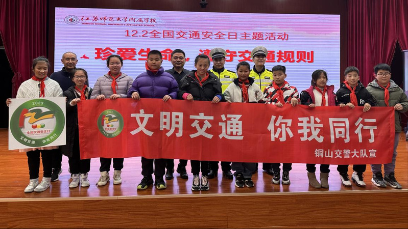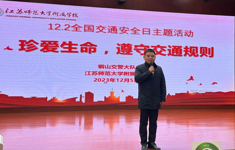 为进一步加强交通安全工作,提升交通安全意识和自我保护能力,12月5日,江苏师范大学附属学校开展了2023年“全国交通安全日”主题教育活动。活动特邀铜山区交警大队马运川警官主讲。江苏师范大学附属学校副校长李贺、安保主任范久田等参加了活动。