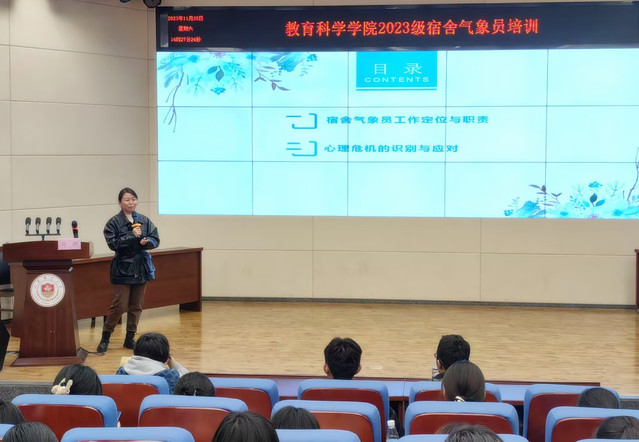 为加强对学生的心理疏导与人文关怀,提升宿舍气象员的专业技能,充分发挥宿舍气象员在心理健康教育工作中的桥梁与纽带作用,完善学院朋辈辅导网络,教育科学学院于12月6日开展2023级新生宿舍气象员专题培训。