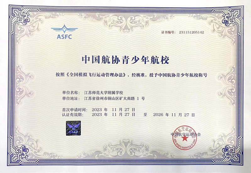近日,经中国航空运动协会核准,江苏师范大学附属学校被授予“中国航协青少年航校”,成为徐州市第一所青少年航校。