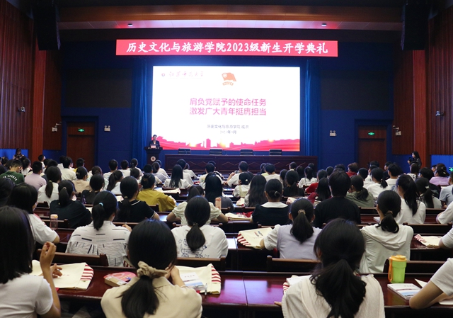 9月11日晚上,历史文化与旅游学院在校分析测试中心100报告厅举行2023级新生开学典礼。院党委书记戚洪、院长刘德州、院党委副书记叶慧、副院长鞠长猛,新生班主任、辅导员和高年级学生代表,以及2023级全体新生参加典礼。叶慧副书记主持典礼。