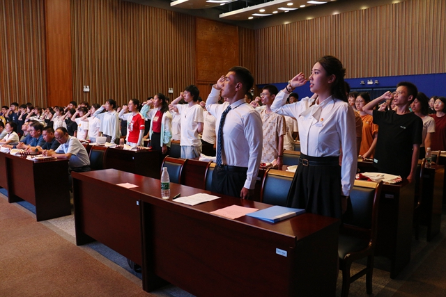 新生代表、2023级历史学专业赵俊恒发言,他代表全体新生郑重承诺:勤于学习、乐于实践,善于吃苦、不懈奋斗,懂得自律、学会自立,承担青年使命、奉献青春力量。