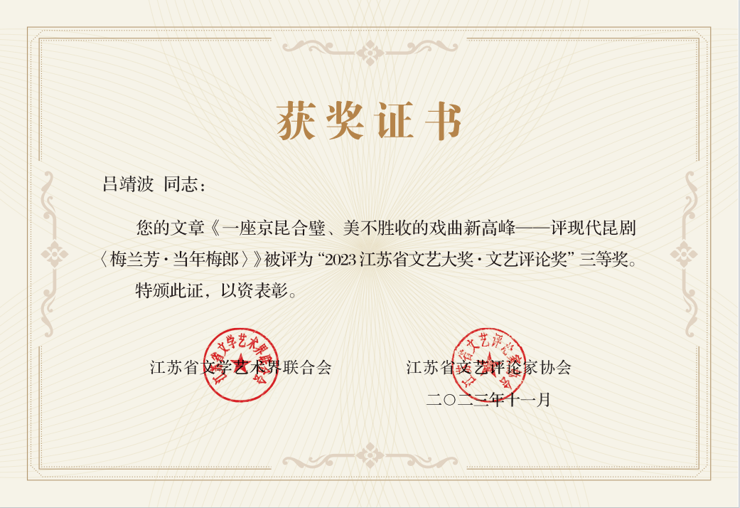 我院徐放鸣教授申报作品《中国形象:审美规律与艺术构建》(徐放鸣等著,高等教育出版社,2023年2月版),荣获2023年江苏省文艺大奖·文艺评论奖,位列一等奖第一名。吕靖波教授申报作品《一座京昆合璧、美不胜收的戏曲新高峰——评现代昆曲<梅兰芳·当年梅郎>》(《艺术百家》,2021年第1期),荣获2023年江苏省文艺大奖·文艺评论奖三等奖。