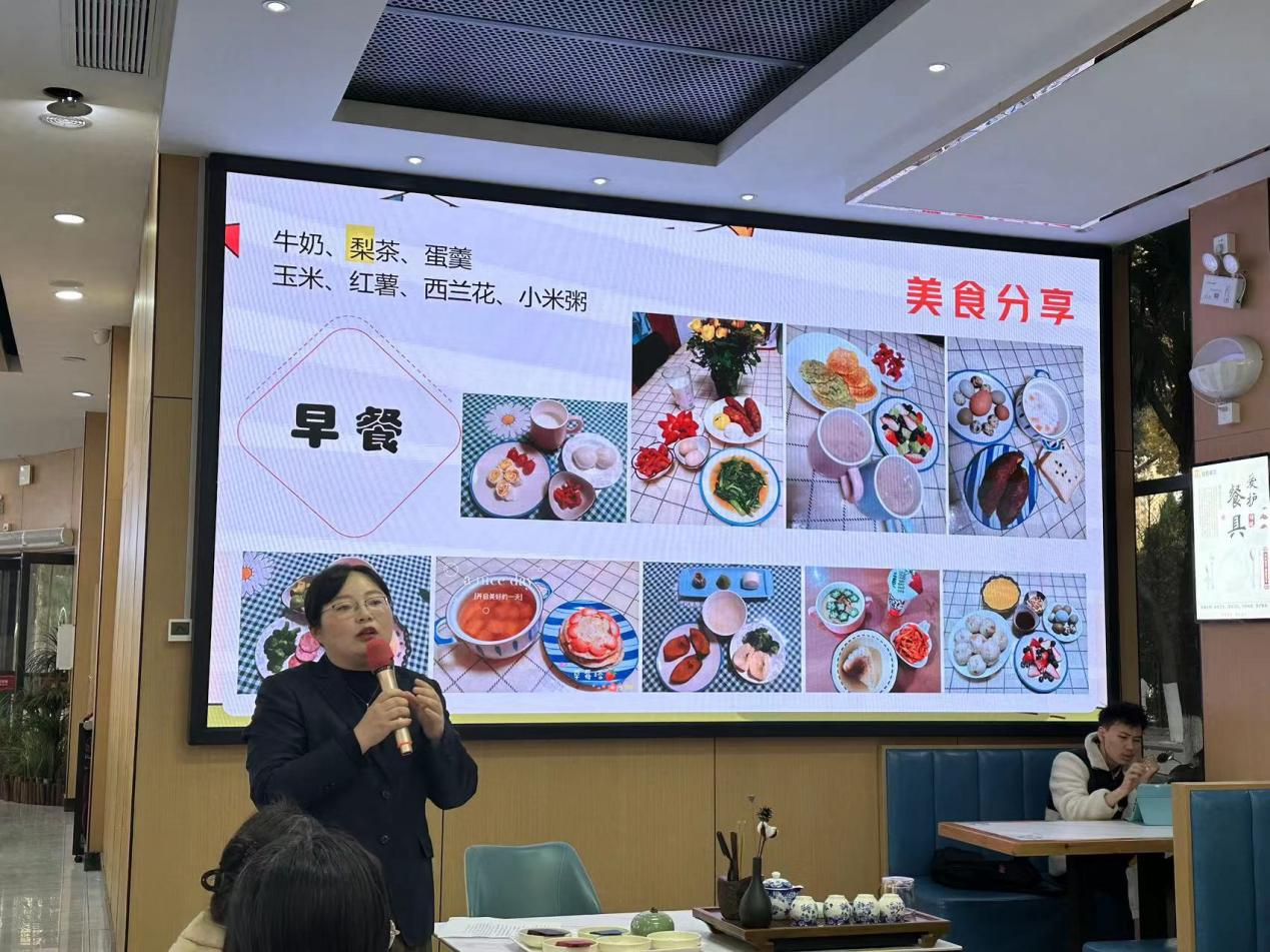 活动开始,协会会长孟春华从冬季运动、饮食、起居、保暖、护肤五个方面与各位会员一起学习、切磋了冬季养生理论知识,并结合时令节气,梳理、总结了冬季常见疾病防范小常识,倡导会员们注重冬季进补养生的同时务必做好冬季疾病预防。接着,会员申明珠老师和付敏主任分享了各自的健康生活经验和养生之道。申老师通过分享自己制作的丰富多彩的日常饮食餐点和手工作品,向各位传递了健康饮食和保持轻松愉悦的心情更有助于身心健康的养生理念,展示了她对生活满满的热爱之情和健康的精神风貌;付主任主要从茶的来源、茶叶的分类制作工序、茶具搭配、泡茶、品茶等几个方面,积极传播中国传统茶文化,她详细讲解了饮茶对健康生活的重要意义,分享了自己从饮茶中悟出的养生感悟,精致的器皿,精心的准备,热情洋溢的讲解,不仅感染了参会人员,还吸引了不少同学驻足聆听和观看。