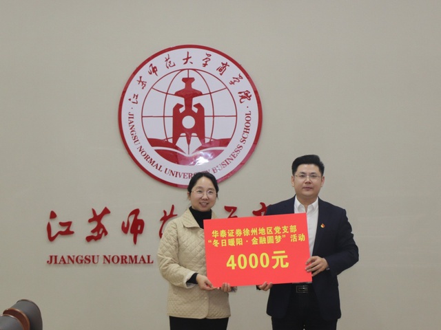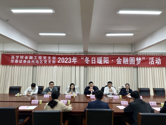 为加强资助育人精准帮扶实效,发挥校企育人合力,12月13日下午,商学院金融工程党支部、学生党支部与华泰证券徐州地区党支部共同开展 “冬日暖阳·金融圆梦”主题党日活动。商学院党委书记钱程,党委副书记吴夏蓉,华泰证券徐州地区党支部书记、建国西路营业部总经理张正兴,华泰证券徐州地区党支部宣传委员、淮海东路营业部总经理焦帅等参加此次活动。