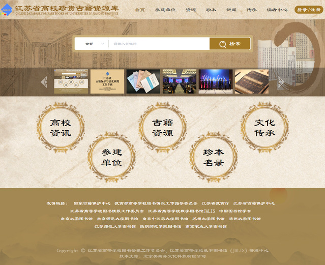 为弘扬中华优秀传统文化、推动数字文化高质量发展、活化古籍特藏的挖掘与利用,南京大学图书馆联合江苏省八家高校图书馆,包括江苏师范大学图书馆,于2022年5月开始规划,11月启动“江苏省高校珍贵古籍资源库”建设。经过一年的筹备建设,现已正式启用。该资源库由江苏省高校图书情报工作委员会牵头立项,是国内首个全省高校携手共建的古籍全文图像联合数据库,为推进古籍研究工作、传播中华优秀传统文化,做出了重要贡献。