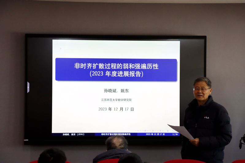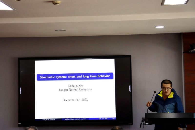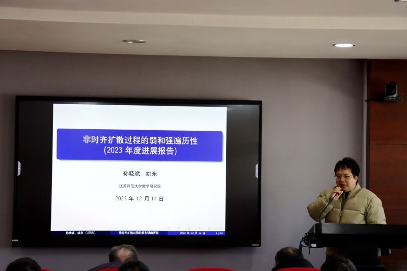 孙晓斌副教授和姚东副教授讨论了非时齐扩散过程弱遍历和强遍历。利用两种不同的距离构造方法(欧式距离复合函数以及依赖于时间的变距离),给出了非时齐扩散过程弱、强遍历的两个判别准则。其中第一个判别方法可处理具有远处耗散性的一般维数扩散过程,而第二个判别方法对于一维扩散过程的指数和非指数遍历(包括代数式遍历、对数式遍历和次指数式遍历等)均能给出较好的收敛速度。姚东还介绍了其在北京访学期间研究的点过程最小间隔问题以及在几种情形(实高斯过程,复解析函数以及高斯矩阵系综)中取得的进展。