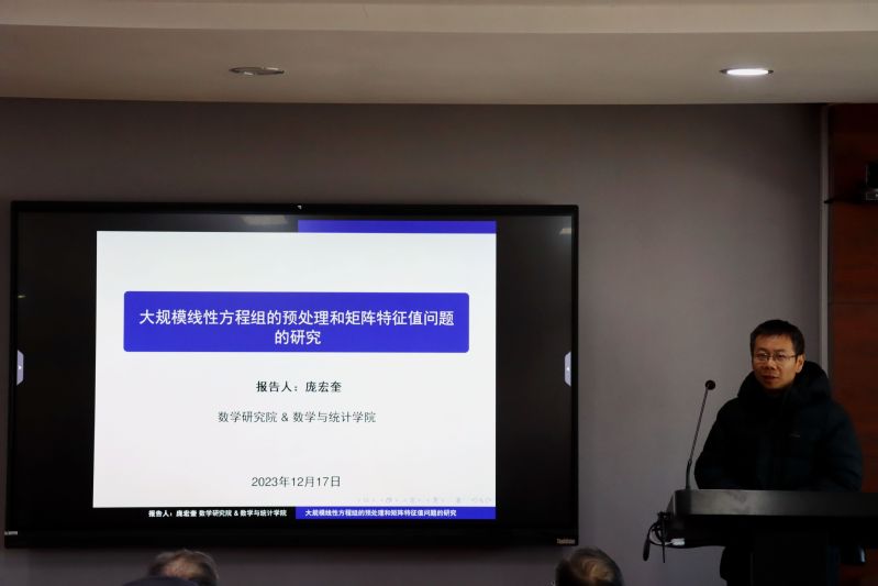 庞宏奎教授首先介绍了大规模结构线性方程组预处理算法方面的研究进展,针对数值求解分数阶反问题时遇到的大规模结构线性方程组设计了高效的预处理子,证明了预处理后矩阵的谱是聚集的,并用数值实验验证了预处理子的有效性。其次介绍了矩阵特征值问题的研究进展,给出了四元数位移求逆算法计算四元数矩阵右特征值问题,此外对量子化学计算中常用的计算矩阵特征值问题的Davison-Liu算法和陈院士所提算法进行了数值比较,并说明了进一步的研究想法。
