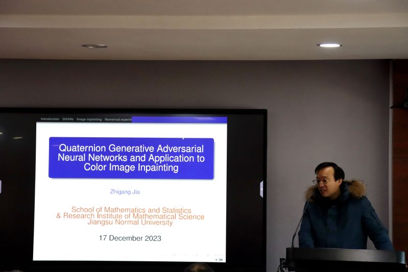 贾志刚教授首先介绍了四元数反卷积算子,构建了四元数生成对抗网络,成功地解决求解带块状缺失的彩色图像填充问题;其次,提出了带注意力机制的二维主成分分析方法,并将其与神经网络方法相结合,可应用于解决基于医学CT图像的癌症识别难题;最后介绍了大规模稀疏矩阵部分特征对的新思路。