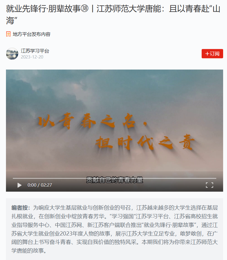 本次评选活动由江苏省教育厅举办,旨在选树推广大学生就业创业典型,发挥就业创业典型的示范引领作用,引导大学生树立正确的成才观、职业观和就业观。自评选启动以来,学院积极响应江苏省教育厅要求,扩大活动宣传,分类开展就业创业人物遴选。通过学院推荐、评审、材料优化等环节,唐能作为“基层就业大学生”典型参加省级评审,经个人事迹和视频评比环节荣获该称号。