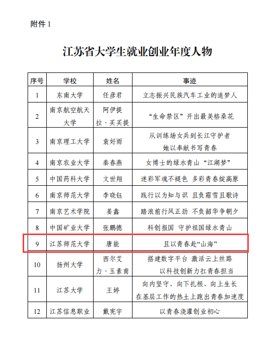 近日,江苏省教育厅公布了2023年江苏省大学生就业创业年度人物推选结果,我院推荐的2019届本科毕业生唐能获“江苏省大学生就业创业年度人物”荣誉称号。