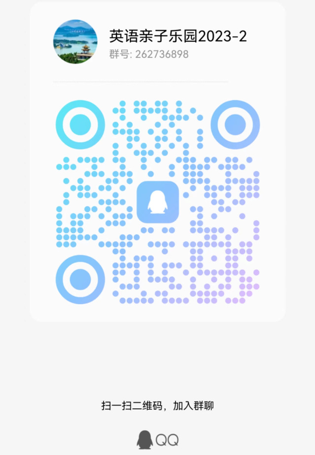 报名方式:凡家有5-7岁宝贝的教职工皆可报名。请有意参加的老师通过QQ扫描下方的群二维码报名(群号:262736898,英语亲子乐园2023-2),全校限额20组,先报先得。加群时请备注所在单位和真实姓名以及宝贝的年龄。活动细节将在群中发布。