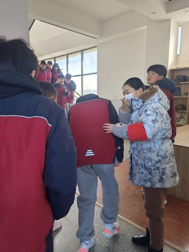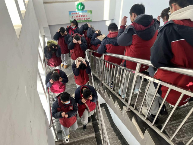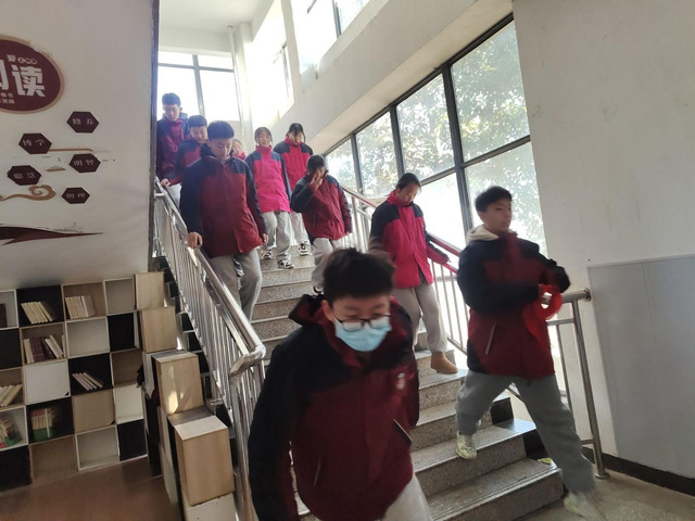 当天上午第一节课课间,初中部教学楼一楼拉起消防疏散的警报,初中部应急疏散演练指挥部总指挥下达了“请同学们立即撤离”的命令。紧接着,各班主任老师迅速到达各班协助上课老师一起组织学生疏散,其他老师们也在第一时间赶到自己当时所在楼层拐角处配合疏散学生。各班学生在老师们的指挥下,弯着腰,猫着步,用手帕、毛巾、衣领等捂住口鼻,沿着学校指定楼梯口快速前进,有序撤离到学校操场的安全地带。随后,各班班主任清点人数,并层层上报,短短几分钟,初中部4000余名师生全部安全疏散撤离。