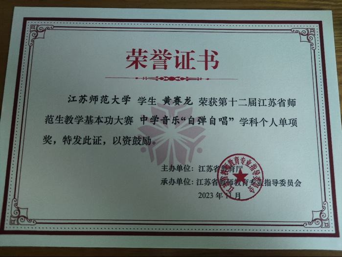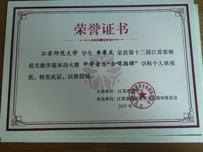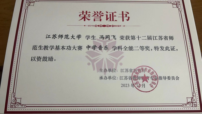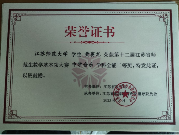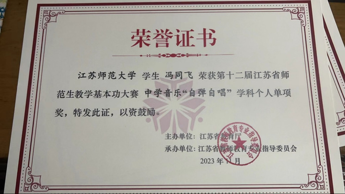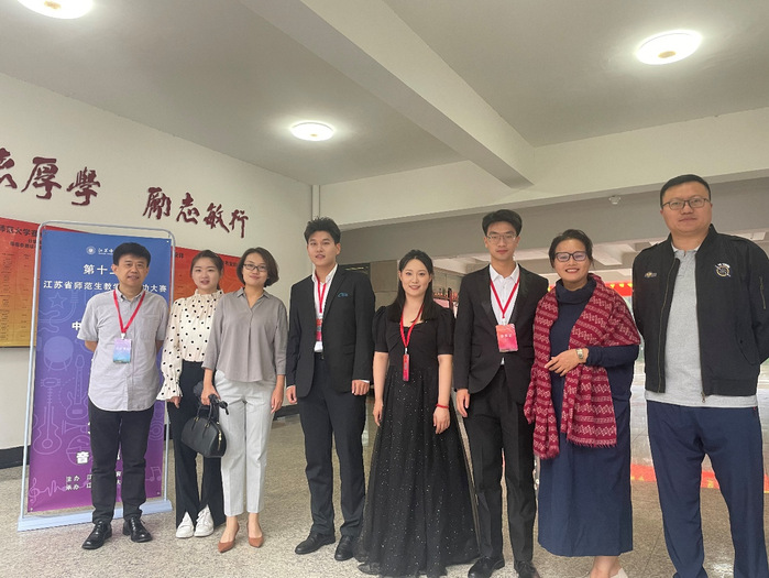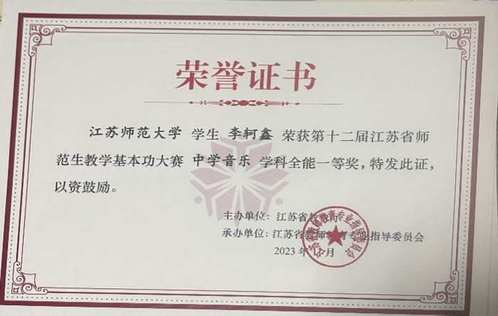 2023年9月23日至24日,第十二届江苏省师范生教学基本功大赛(音乐组)于江苏师范大学音乐学院隆重举办。自大赛通知发布以来,我院相关领导对此高度重视,经前期院赛选拔、随机抽取等方式,确定2020级音乐学师范专业本科生;李轲鑫、黄赛龙、冯同飞三位选手参赛,最终取得优异成绩。其中,李轲鑫获中学音乐学科全能一等奖;黄赛龙获中学音乐学科全能二等奖、合唱指挥专项奖、自弹自唱专项奖;冯同飞获中学音乐学科全能二等奖、自弹自唱专项奖;再次刷新了我院音乐学师范专业学生在该项大赛中取得的成绩。