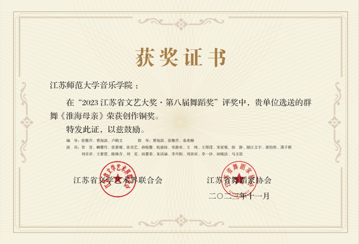为深入学习贯彻习近平总书记参观淮海战役纪念馆时的重要讲话精神,讲好中国共产党团结带领人民披荆斩棘、不懈奋斗,不断从胜利走向胜利的故事,江苏师范大学音乐学院舞蹈系创作的舞蹈作品《淮海母亲》,入围了江苏省文艺大奖·第八届舞蹈奖的决赛,并于2023年11月2日登上南通更俗剧院参加决赛,经专家评审、专家现场打分、终审会议评议等环节,最终荣获2023江苏省文艺大奖·第八届舞蹈奖创作铜奖。