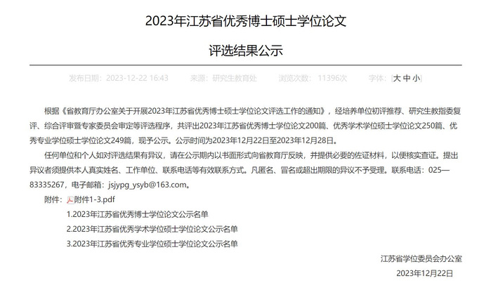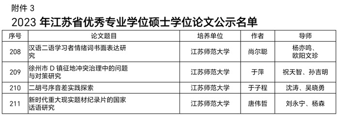 近日,江苏省教育厅、江苏省学位委员会公布了2023年江苏省优秀博士硕士学位论文评选结果。共评出2023年江苏省优秀博士学位论文200篇、优秀学术学位硕士学位论文250篇、优秀专业学位硕士学位论文249篇,其中音乐类优秀博士、硕士学位论文4篇。我院沈涛副教授指导的于子程专业学位硕士论文《二胡弓序音差实践探索》入选江苏省优秀硕士学位论文,这是我院近年来研究生培养的又一项重要成果,充分展示了音乐学院在研究生人才培养质量方面的成效。