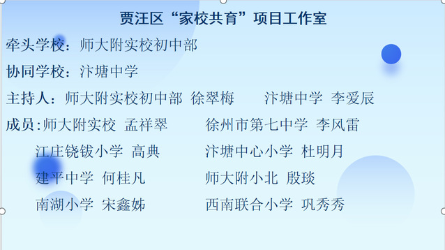 2024年1月5日下午,贾汪区“家校共育”项目工作室交流研讨活动在牵头学校江苏师范大学附属实验学校初中部举行。贾汪区教育局教育科范振海科长、索志豹科长、张二辉主任出席活动,师大附实校初中部执行校长张平,以及全体工作室成员。