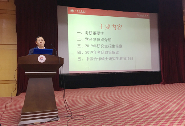 会议伊始,张院长代表学院宣读《关于表彰2018年“考研优秀学子”和“考研组织奖”的决定》。在热烈的掌声中,学院领导依次为31名考取研究生的同学及获得“考研组织奖”的14机51班、14机61班颁发荣誉证书。随后,邢院长为同学们作了考研政策解读和考研动员,他从考研重要性、学科学位点介绍、2019年研究生招生简章、2019年考研政策解读、中俄合作硕士研究生教育项目等五个方面作详细解读。随后,8名具有代表性的考研优秀学子分别从院校选择、公共课学习、专业课复习、应对复试及考研心态调试等多方面多角度详细分享了考研经验,他们精彩到位的发言和毫无保留的分享赢得现场掌声不断。