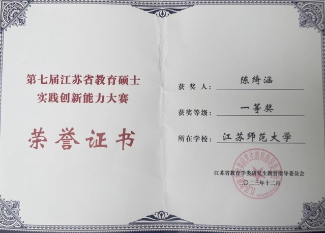 近日,由江苏省教育学类研究生教育指导委员会主办的江苏省第七届教育硕士实践创新能力大赛成绩揭晓,我院教育硕士研究生陈绮涵喜获一等奖。我院刘翠老师全程指导。