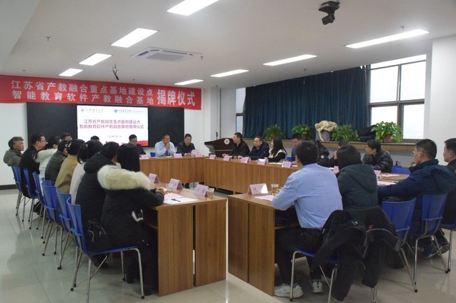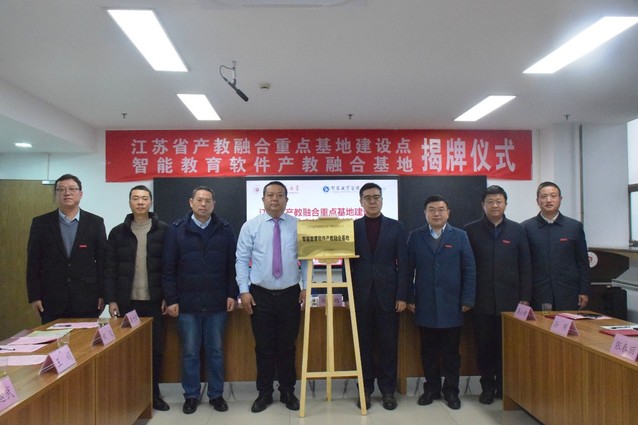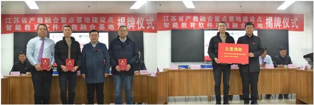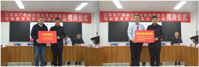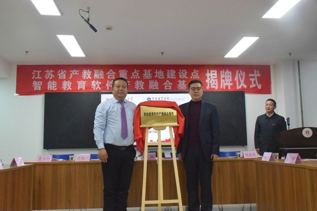 赵鹏和李刚共同为江苏省产教融合重点基地建设点(智能教育软件产教融合基地)揭牌。