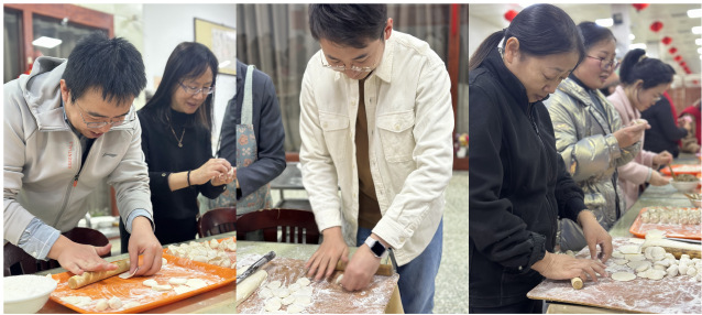 在活动第三个阶段,老师们齐聚教工餐厅,举行包饺子联欢会。大家现场展示包饺子的技能,活动气氛热烈,欢声笑语不断。伴随着愉悦的笑声,一盘盘皮薄馅大、热气腾腾的饺子端上桌来,大家围坐在一起,观看各系精心准备的节目,感受着学院“大家庭”的温暖。为学院庆生准备的8周年生日蛋糕将活动氛围推向高潮,正是在每位老师的努力下,学院才能稳步前进,生日蛋糕是对学院的祝福,也是对每位一起奋斗的老师表达感谢。伴随着活动的进行,神秘的抽奖环节为老师们带去惊喜。