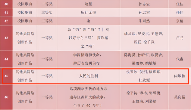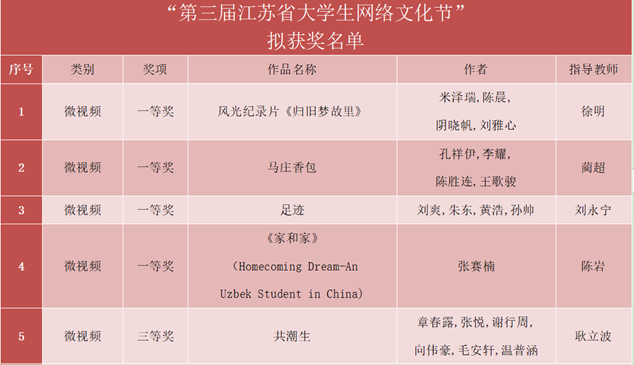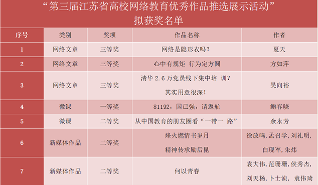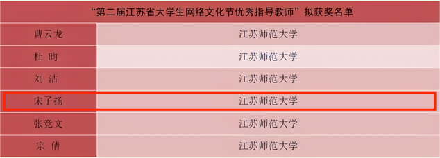 在第三届江苏省大学生网络文化节暨高校网络育人优秀作品推选展示活动(简称“一节一推选”)中,我院师生总计获得7项奖项,其中一等奖1项,二等奖2项,三等奖4项,学院获评江苏师范大学第十三届校园网络文化节“优秀组织奖”。宋子扬老师获评第二届江苏省大学生网络文化节“优秀指导教师”。