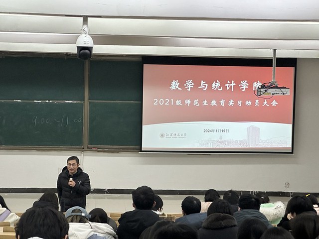 为顺利完成2021级教育实习工作,2024年1月19日上午,数学与统计学院在泉山西教阶101教室召开实习动员大会,学院副院长李建波、数学系主任张运涛、辅导员马云老师和2021级数学与应用数学专业全体同学参加会议。