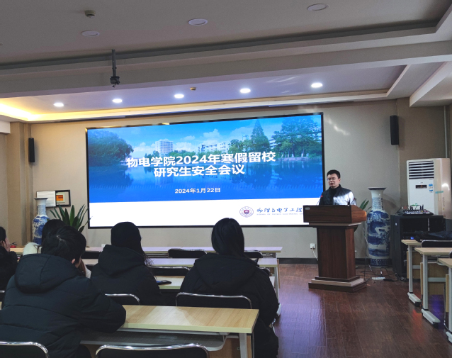 1月22日,物电学院在7#-327会议室召开2024年寒假留校研究生安全会议。学院副书记赵明、研究生辅导员周浩、全体留校研究生参加会议。会上,赵明副书记对研究生假期留校表示理解,勉励他们充分利用留校时间,认真开展科研实验。他指出,安全工作是正常生活学习的前提和保障,要增强安全防范意识,学习安全防护知识技能,消除安全隐患,确保度过平安假期。并重点围绕安全用电和宿舍防火开展教育,通过举例和安全用电小贴士的形式,让在座研究生意识到了消防工作的重要性,提高了安全用电技能。最后,赵明副书记提示在座研究生,如果生活学习上有任何困难和诉求,要及时向导师、辅导员和学院提出,学院会尽量为大家解决。随后,研究生辅导员周浩以案例形式,从消防、财产、网络、交通、食品等方面开展安全教育,希望留校研究生能从案例中受到警示,遵规守纪、识别并预防风险。