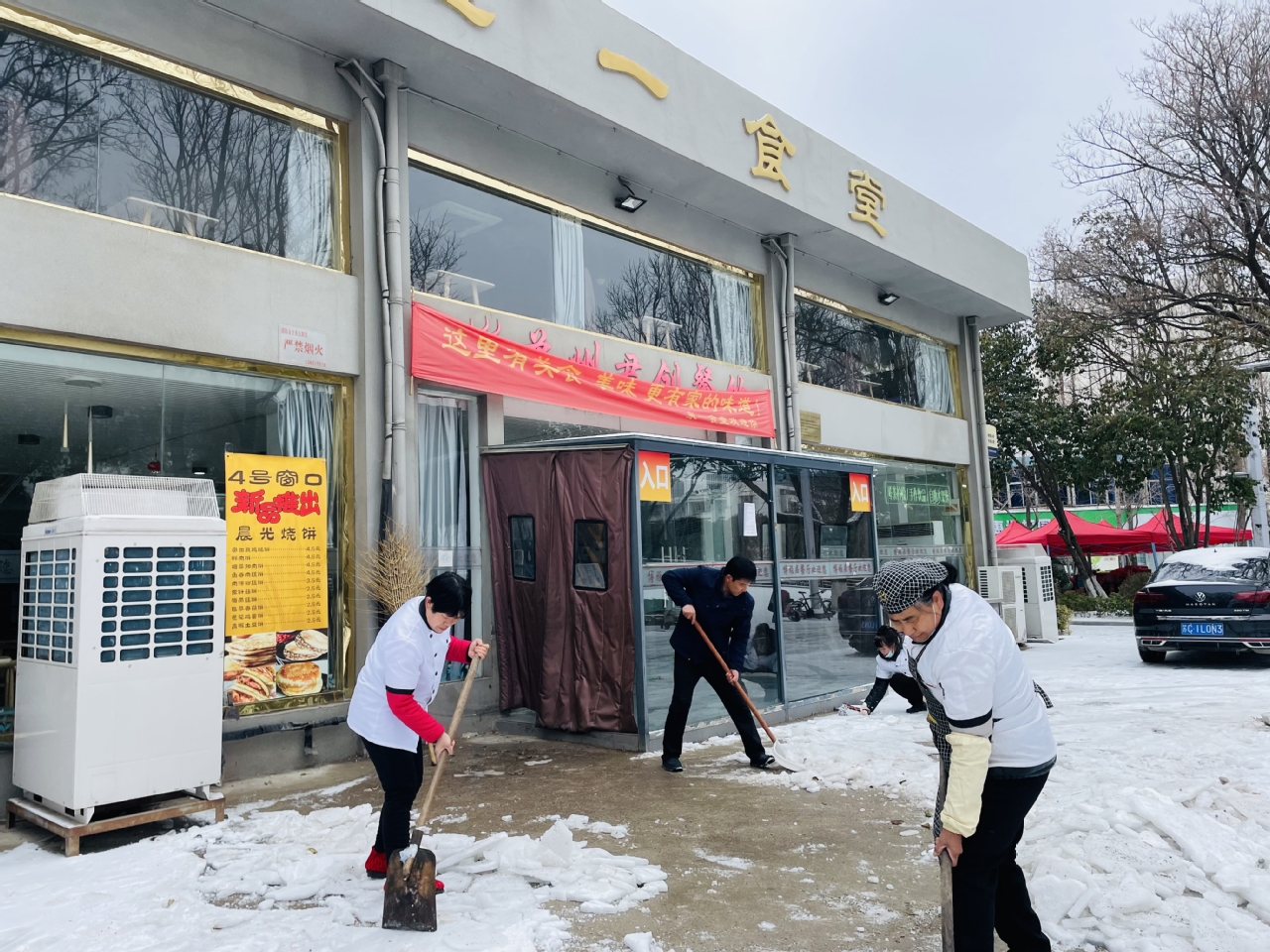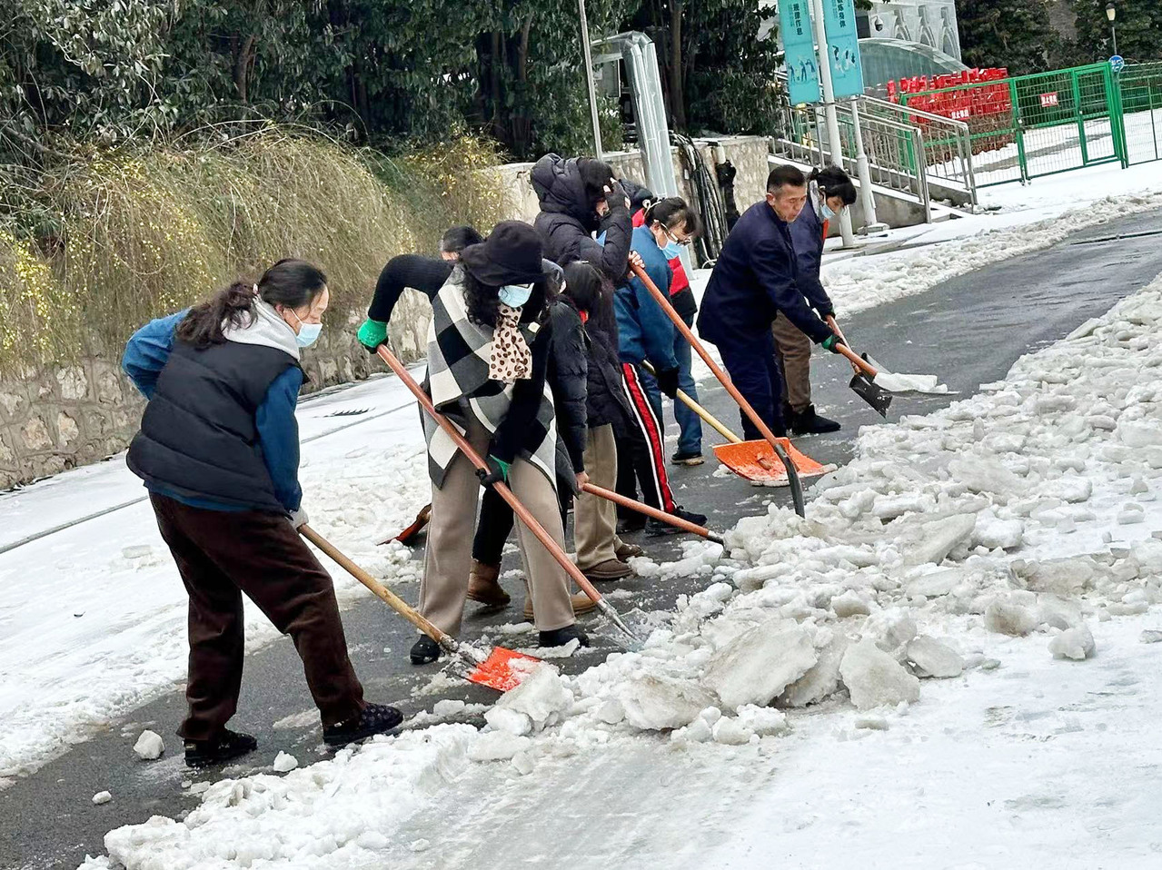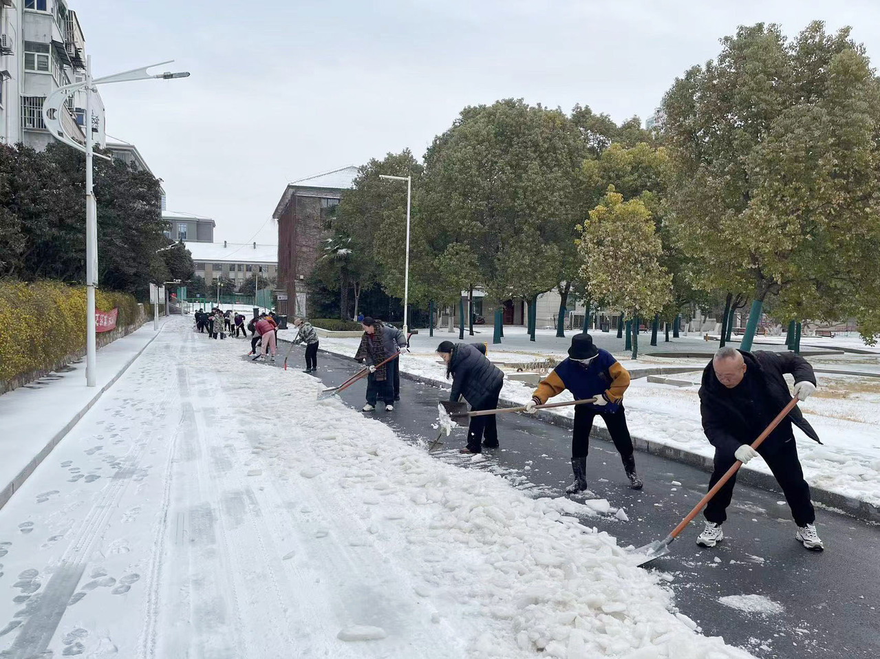 在除雪行动中,后勤集团的员工们展现了不畏严寒、甘于奉献的精神风貌。他们冒着严寒,分区域开展积雪清扫工作,无论是教学楼、宿舍楼,还是食堂、超市,都留下了他们顶风冒雪、辛勤劳动的身影。虽然室外的气温非常低,寒风凛冽,但大家仍然干劲十足,挥动铁锨、雪铲,齐心协力、配合默契,整个场面热火朝天。