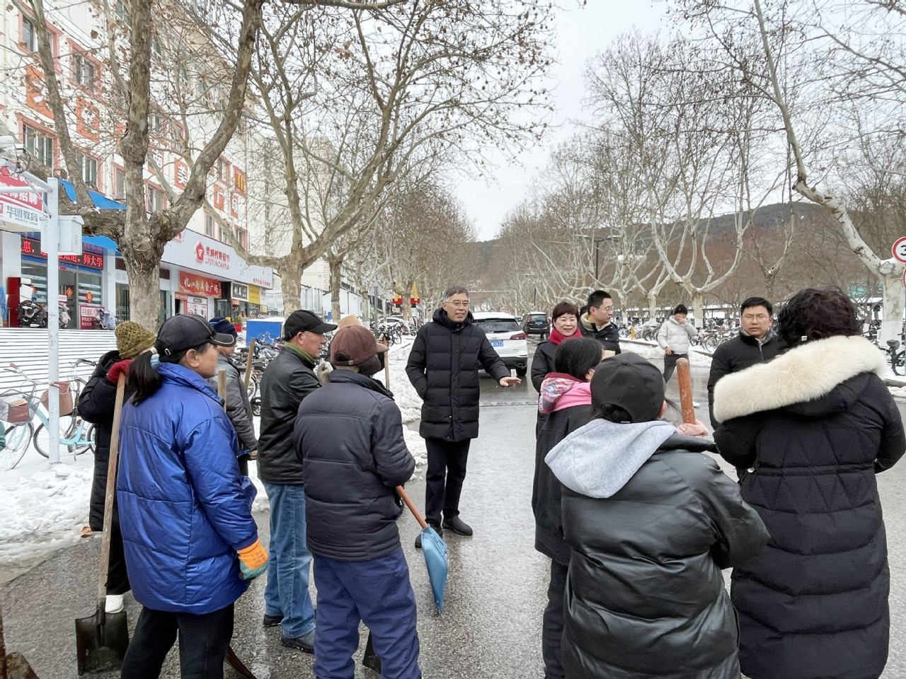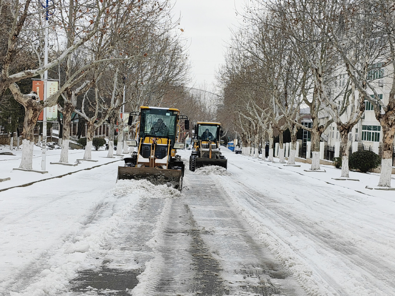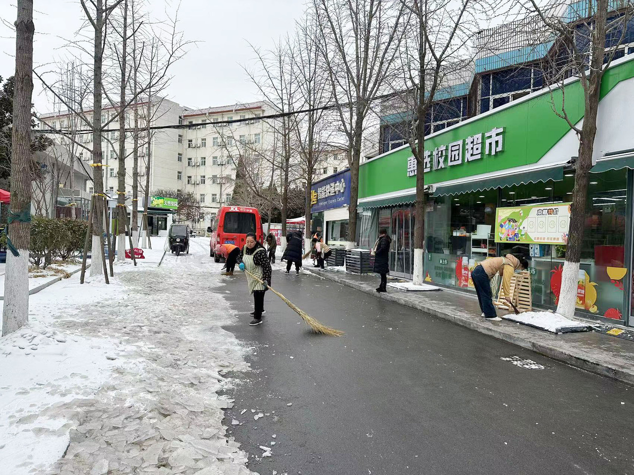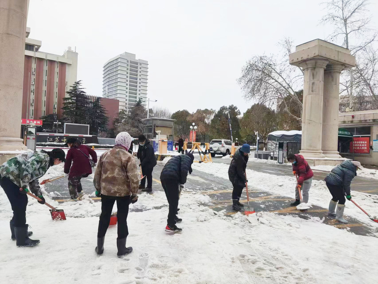 开学在即,徐州出现少见的持续冻雨、冰粒和雨夹雪的恶劣天气,给校园出行造成极大不便。为确保校园道路畅通,保障我校新学期开学师生返校安全,集团及时启动冰冻雨雪天气的应急预案,雨雪前安排物业同志在主要路段撒了融雪剂,雪停后,2月22日清晨,组织物业人员及各岗位员工,调度两台除雪车,全面投入到扫雪除冰工作中。泉山校区和云龙校区根据预先划分的区域,有条不紊地开展清扫积雪的行动。