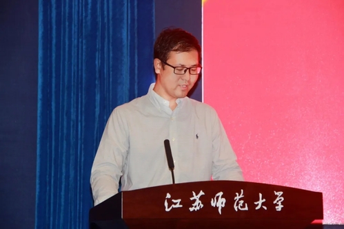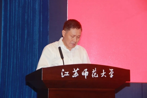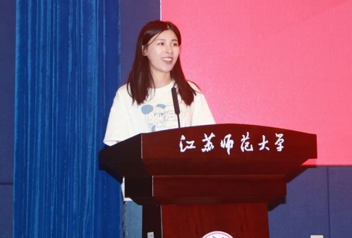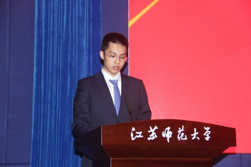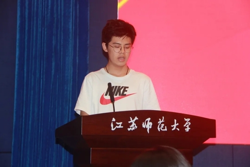 20机51班陈诺同学代表本科新生发言,他表达了对江苏师范大学生活的期待,表示将珍惜时光,好好学习,用奋斗标注青春底色,争做有理想、有本领、有担当的时代新人。