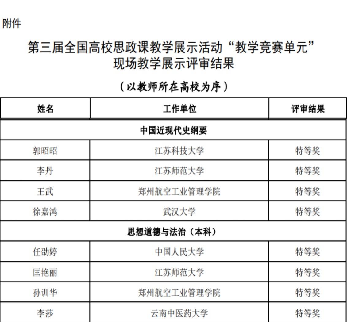 近日,教育部网站公布了第三届全国高校思想政治理论课教学展示活动“教学竞赛单元”评审结果,我院匡艳丽、李丹两位老师历经“国赛资格赛江苏省选拔”、“国赛初赛”和“现场展示”三个环节,面对全新、高难度赛制,顶住压力、稳健发挥,分别荣获本科组“思想道德与法治”课程、本科组“中国近现代史纲要”课程特等奖,获奖等级和数量位均居全省本科高校前列。