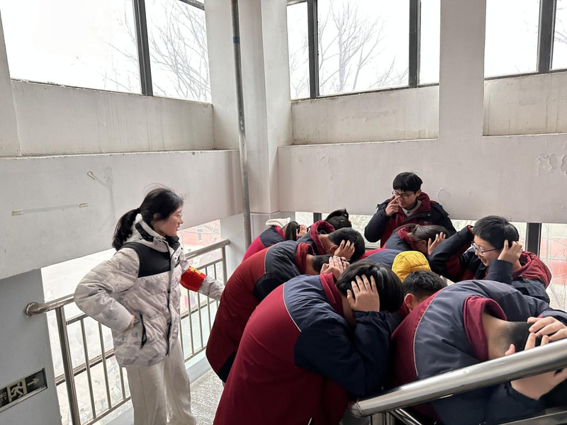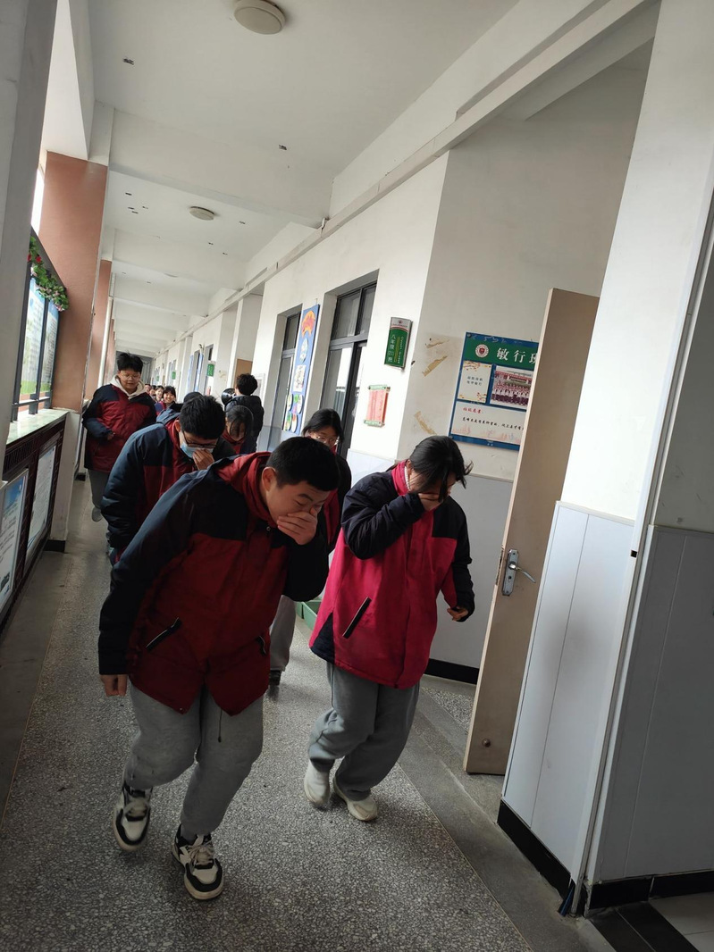 当天上午紧急疏散命令一经下达,各班主任老师迅速到达各班协助上课老师一起组织学生疏散,其他老师们也在第一时间赶到自己当时所在楼层拐角处配合疏散学生。各班学生在老师们的指挥下,弯着腰,猫着步,用手帕、衣袖等捂住口鼻,沿着学校指定楼梯口快速前进,有序撤离到学校操场的安全地带。随后,各班班主任清点人数,并层层上报,短短几分钟,初中部4000余名师生全部安全疏散撤离。