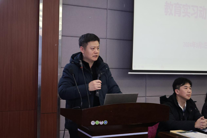 大会第二项,由实习指导教师代表张涛老师发言,他提醒同学们要积极与实习指导老师联系,抓住一切学习机会,“走出理论,走进课堂”。
