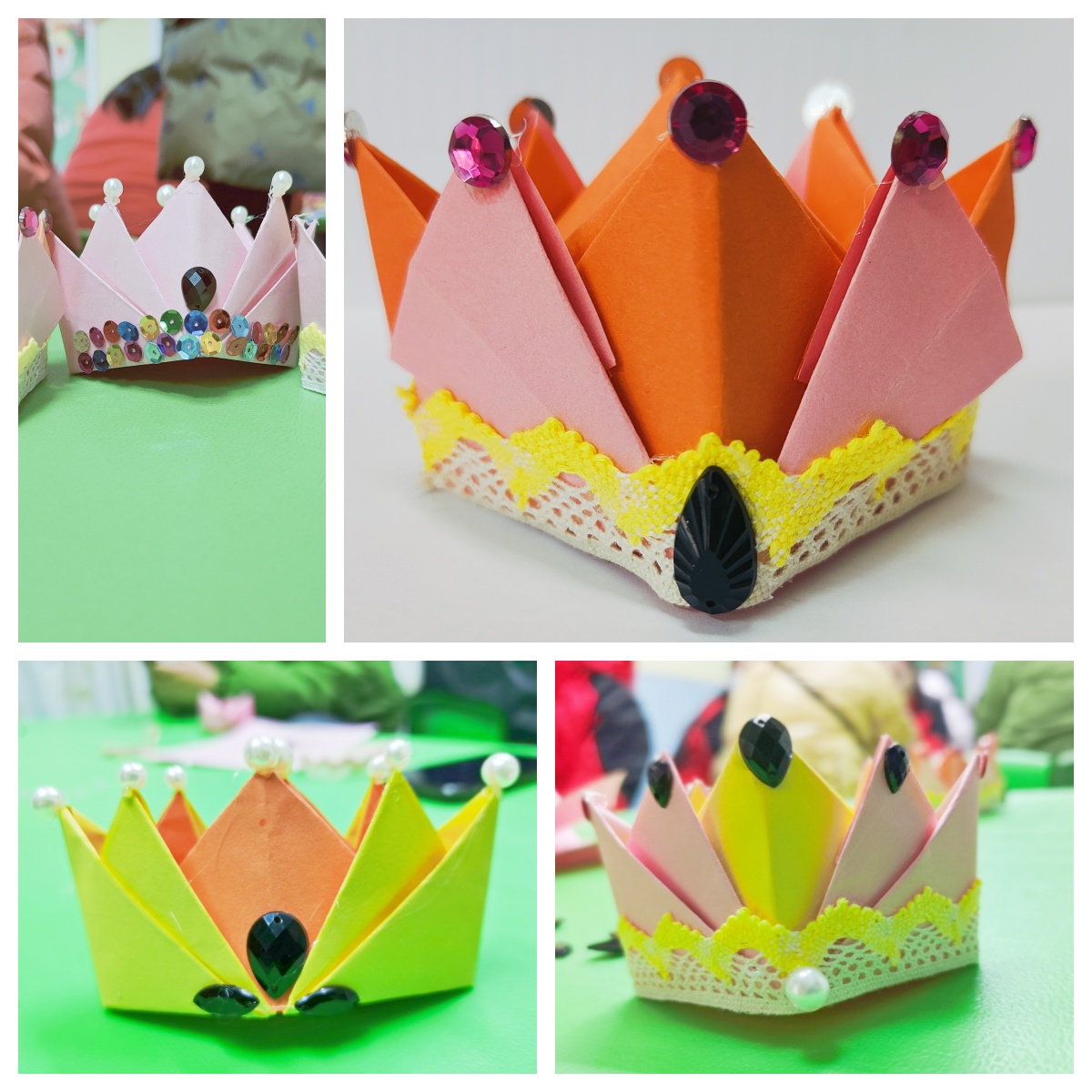 活动开始,首先大家一起观看视频学习了折纸皇冠的具体方法。随后,大家迫不及待的开始创作自己的作品。看!一张张彩色的卡纸在大家手中上下左右不断地翻折着。不一会儿,一个个栩栩如生的皇冠就出现在大家手里。在创作过程中大家相互交流着自己的经验和技巧,整个活动过程气氛融洽,充满了欢声笑语。看着自己亲手制作的作品,大家相互展示,分享着成功的喜悦。