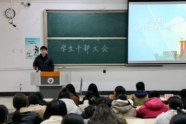 3月6日下午,历史文化与旅游学院在17号教学楼100A召开新学期全体学生干部大会,部署新学期学院学生工作。院党委副书记杜登,专职辅导员赵宇、王亦男、于雯静、周鑫,本科生、研究生全体学生干部参加会议。
