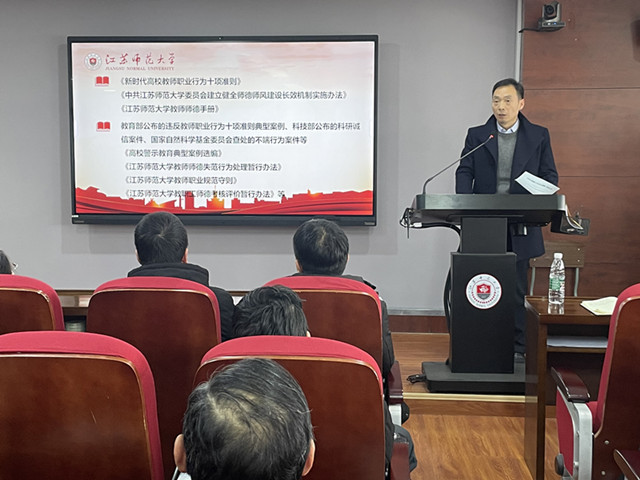 会上,孙正洪书记带领与会人员集中学习了《新时代高校教师职业行为十项准则》《江苏师范大学教师职业规范》《江苏师范大学教师师德失范行为处理暂行办法》《中共江苏师范大学委员会建立健全师德师风建设长效机制实施办法》《高校警示教育典型案例选编》等师德师风建设相关文件,并通报了学院2024年度师德建设工作计划,对学院下一步师德建设提出了具体要求。