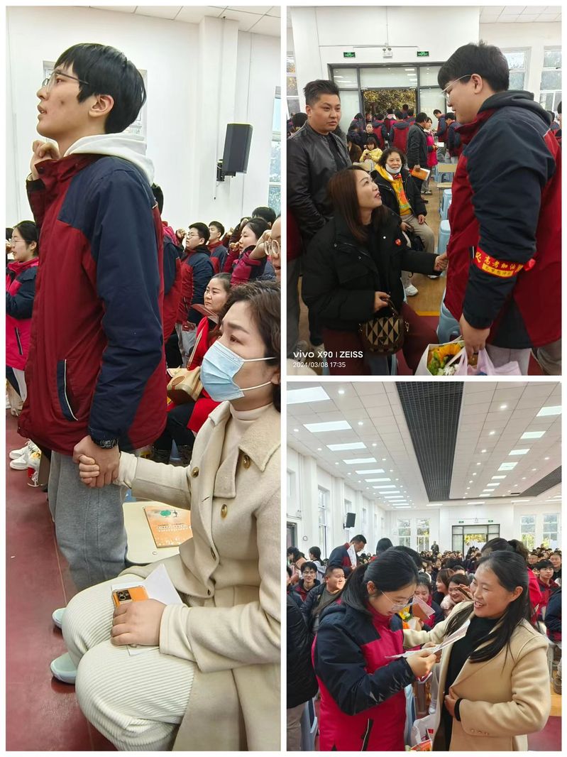家校合力,寄语传情。在备战高考的关键时刻,家长们也送上了自己的祝福。高三家长代表贾先生从自己的青春谈起,激情澎湃、情真意长,他勉励高三学子要勇于拼搏,行至所向;一束鲜花,一个拥抱、一封家书、一声叮咛的活动让在场的高三师生内心澎湃,倍感暖心。家长和孩子紧紧握在一起的手、拥抱在一起的身体……更让现场温情满溢,让人不觉热泪盈眶。