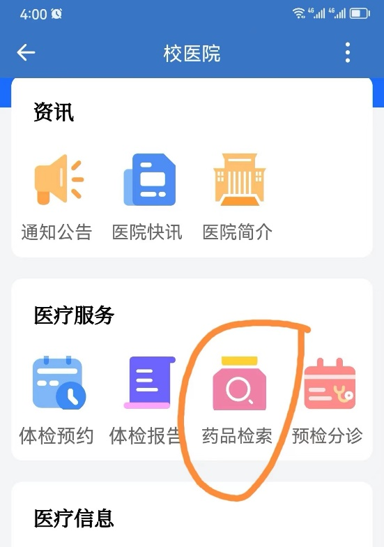 4. 找到医疗服务板块中的药品检索点开