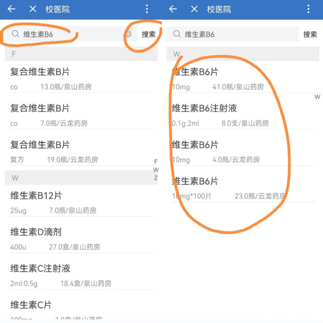 5. 在搜索框中输入要查询的药品后点击搜索,出现搜索出的药品及药品存放地点(泉山校区还是云龙校区)。