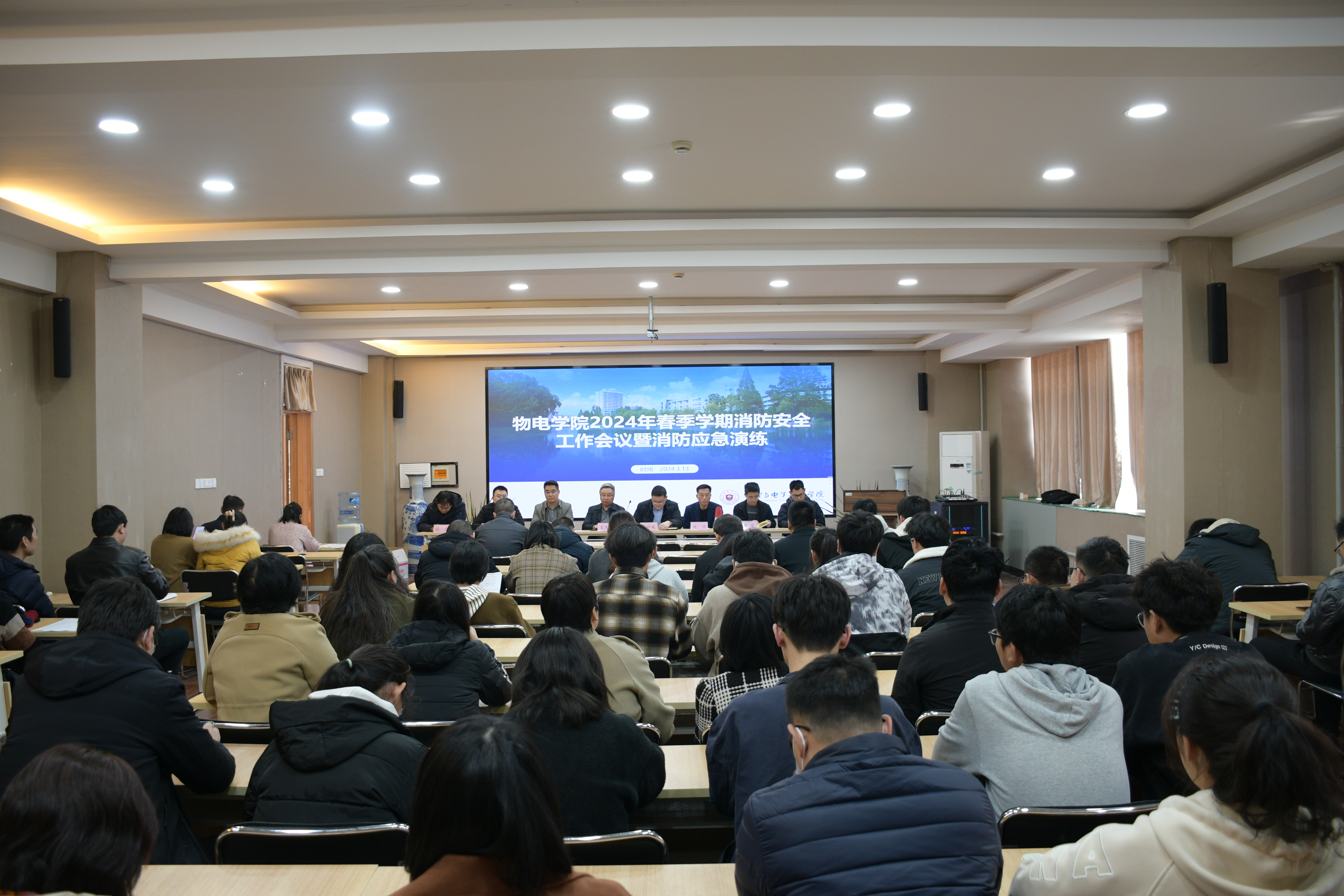 2024年3月13日下午,物电学院召开消防安全工作会议暨消防应急演练,保卫处有关领导、物电学院全体教职工及学生代表参加。会议由院党委副书记赵明主持。