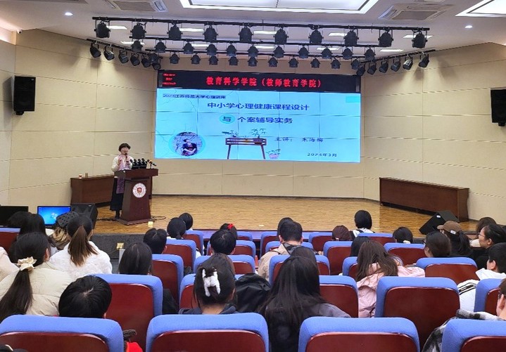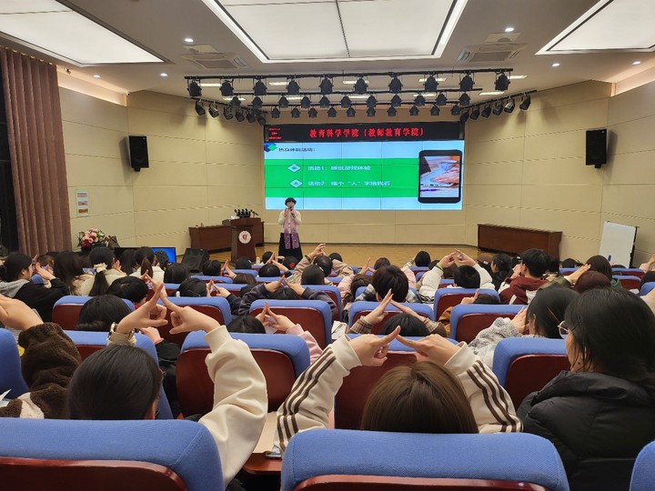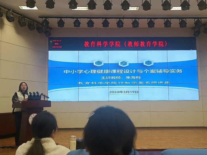 朱海梅老师围绕“中小学心理健康课程设计和个案辅导实务”为同学们呈现了一堂别具特色的课程。朱老师首先介绍了心理健康活动课的性质,围绕中小学心理健康课程该如何设计为切入点,通过现场热身活动体验、心理健康结构化课程设计以及中小学心理健康课程六大板块进行了具体讲解。朱海梅老师借用现实课程案例“情绪自我管理”与“人际,让生活更美好”让同学们更深切地体会到心理健康课程设计的魅力。此外,朱海梅老师分享了一个高中生心理辅导案例,从心理咨询、危机干预、后续追踪处理等方面作了详细分享,为同学们真实展现了一线中学心理健康教师的具体工作。