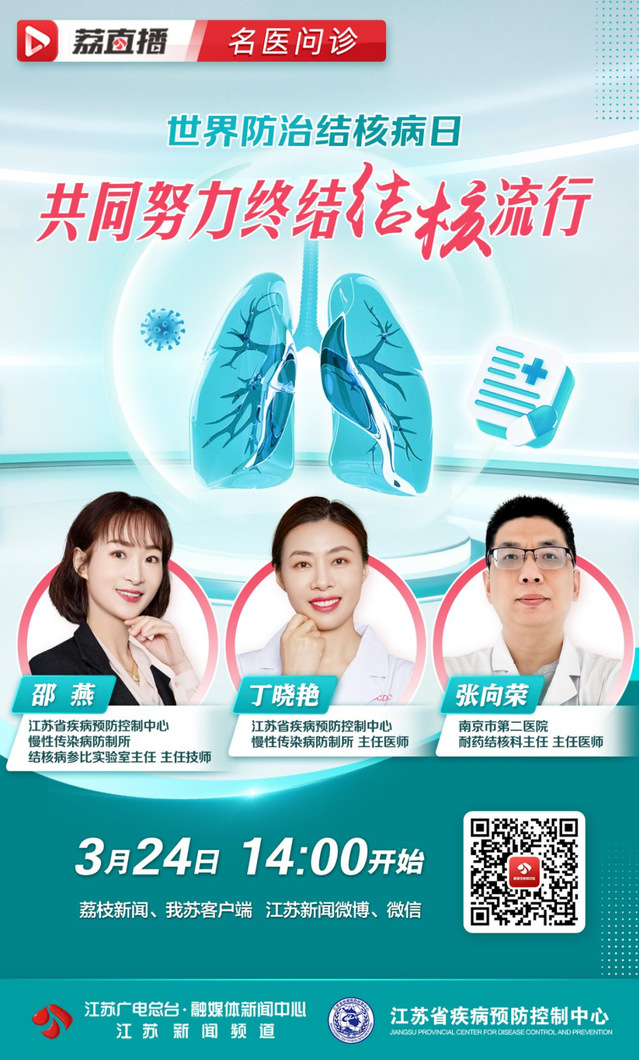 3月24日14点,江苏省疾控中心慢性传染病防制所主任医师丁晓艳、结核病参比实验室主任邵燕主任技师和南京市第二医院耐药结核科主任张向荣主任医师做客江苏广电总台“荔直播”名医问诊,解答结核病防治相关热点问题。直播详情请扫下方二维码。