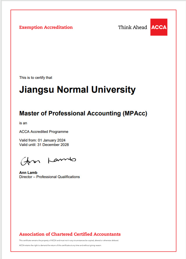 根据ACCA的免试规定,江苏师范大学商学院MPAcc学生仅需通过两门必修科目(即《战略商业领袖(StrategicBusiness Leader)》《战略业务报告(Strategic BusinessReporting)》)考试,以及四门选修科目(即《高级财务管理(Advanced Financial Management)》《高级业绩管理(Advanced Performance Management)》《高级税务(AdvancedTaxation)》《高级审计与认证业务(Advanced Audit and Assurance)》)中的任意两门科目考试,再完成职业道德与技能模块(EPSM)后,成为ACCA准会员。在积累3年工作经验后,即可申请成为ACCA会员。