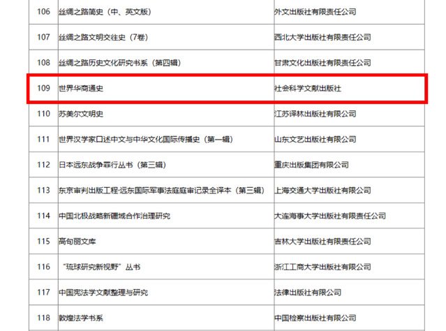 近日,国家出版基金规划办官网对2024年度国家出版基金资助项目予以公示。我院张秋生教授担任首席专家的国家社科基金重大项目《世界华商通史》(五卷本)名列其中,计划于社科文献出版社出版。该著于2023年已获批国家“十四五”社科重点出版项目。