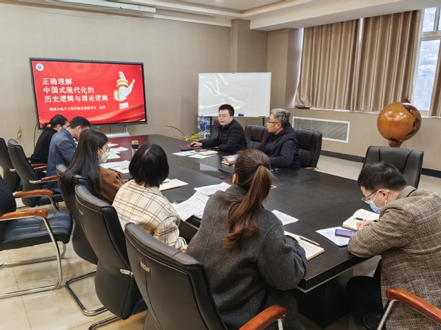 物电学院行政支部于3月27日在7#325会议室隆重开展了《正确理解中国式现代化的历史逻辑与理论逻辑》的党课活动。本次党课由支部书记赵明主讲,他围绕中国式现代化的历史演进、理论体系及重要意义进行了深入而系统的讲解。