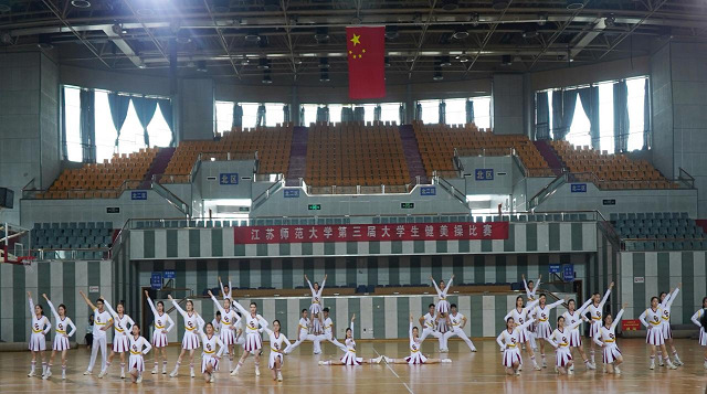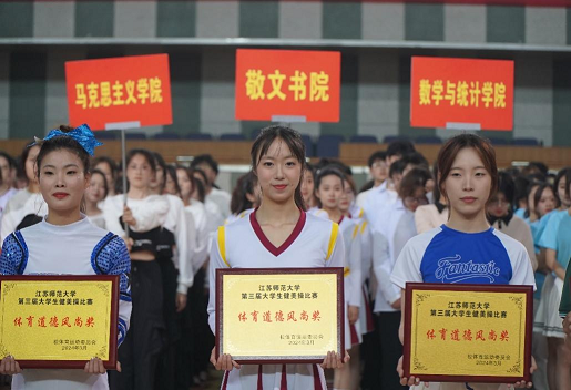 3月30日下午,由校体育运动委员会主办,校学工处、团委、研究生院协办的江苏师范大学第三届大学生健美操比赛在泉山校区体育馆举行,敬文书院代表队在比赛中表现优异,最终以93.5的高分取得第一名的好成绩,荣获“体育道德风尚奖”。