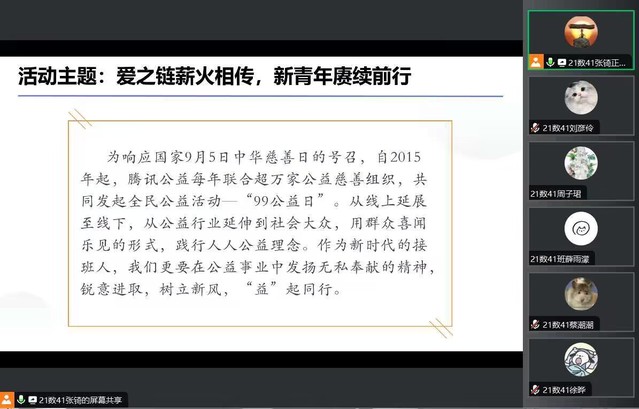 各班以多种多样的形式开展了此次活动。22数41班于2023年9月10日晚七点开展了“爱之链薪火相传,新青年赓续前行”主题团日活动,同学们在团支书的带领下了解了99公益日的由来,通过观看视频《每一天,每一年,每个人,都是99公益日的创造者》,还有阅读文章《“益”路同行,共促互联网公益高质量发展》,同学们了解到99公益日期间腾讯公益通过跨平台配捐,进一步回归用户,也吸引了更多的公益组织参与,通过更多元、更便捷的公益互动,让善意在人与人之间流动。22数11班于2023年9月10日开展了“盛夏的故事”暑期志愿服务经历分享会,班级同学积极踊跃发言,大家也纷纷表示,自己通过暑假这样一个宝贵的机会,体会到了做公益的意义和志愿服务的真谛,领悟到以无私奉献、勇于担当为底色的公益精神是无数前辈传承下来的宝贵精神财富。21数13班在团支书的带领下共同观看了影片《谢谢你,陌生人》,感受到了身边好人传播下来的正能量,同时也明确了大学生的责任:我们要讲好身边模范向善故事,大力弘扬他们舍己为人的光辉品格,积极营造全民支持公益事业的浓厚氛围,为实现美好生活做出更大贡献!