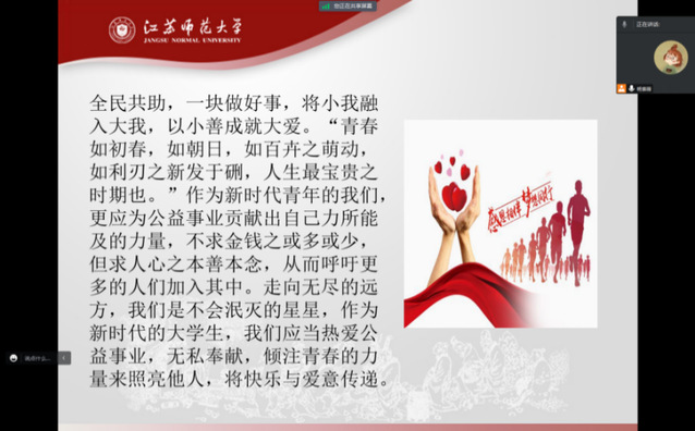 通过本次主题团日活动,同学们领悟到了参与公益事业,并在其中发扬无私奉献精神的意义。“人们赞美流星,是因为它燃烧着走完自己的路程”也许流星只是短暂的耀眼过,但当它划破黑暗时,人们无不惊叹那一瞬的光芒。人的生命在漫漫长河里显得极其有限,但一个人倘若能在这有限的生命中学会奉献,又何尝不是一种“永生”。作为新时代青年的我们,应为公益事业贡献出自己力所能及的力量,不求金钱之或多或少,但求人心之本善本念,从而呼吁更多的人们加入其中。