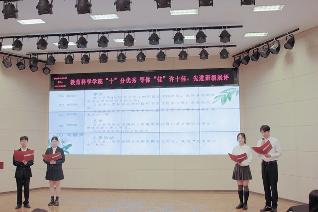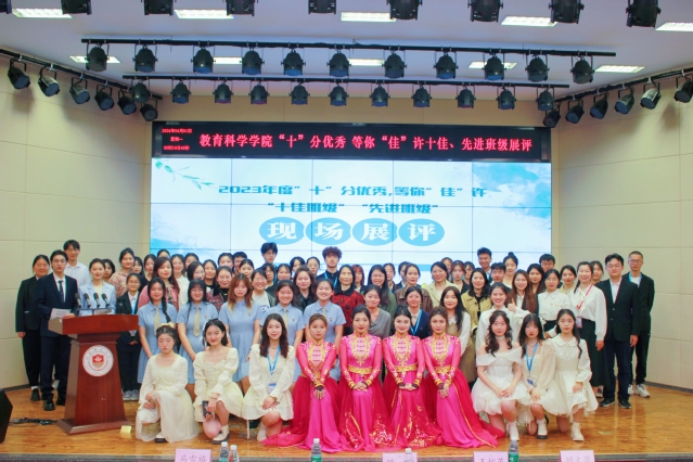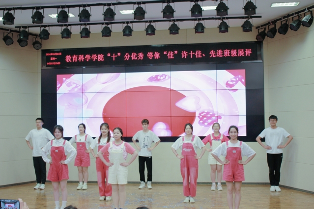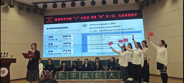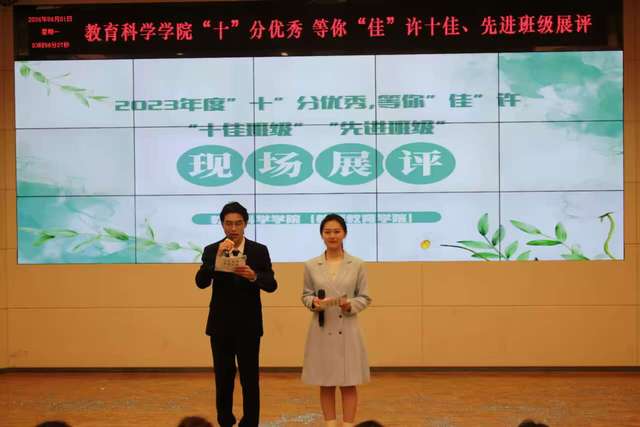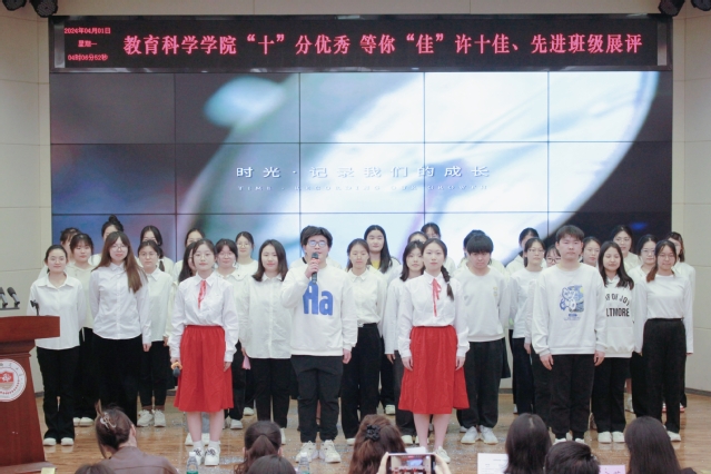 为增强大学生集体观念、协作精神和团队意识,营造健康向上的班级风气和严谨浓郁的学习氛围,4月1日晚教育科学学院举办了“十”分优秀,等你“佳”许——2023年度“十佳班级”“先进班级”展评活动。本次展评由院党委副书记陈遥、教师班主任代表王桃英、辅导员马雪梅、常蒙、学生代表顾文萱担任评委,获评校“文明班级”的9个集体及其班主任参加展评。