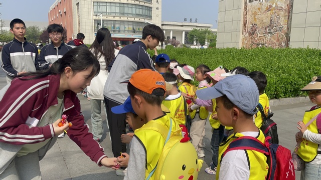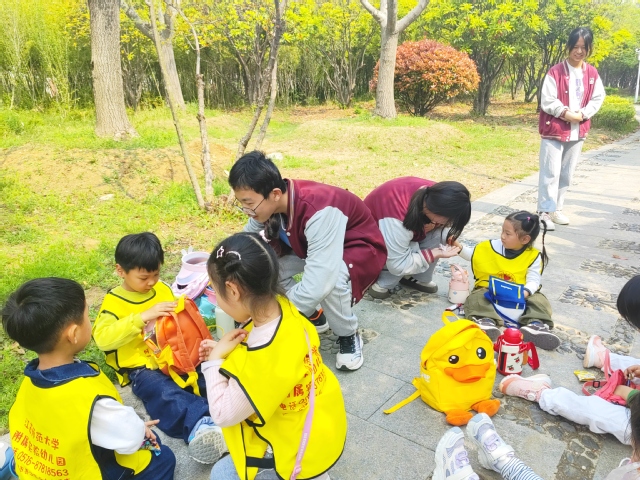 参观活动结束后,来到了学校西侧的林荫小道。在这里,孩子们稍作休息,享受着春日的宁静和美好。孩子们在树荫下交流着所见所闻,分享着彼此的欢乐,还与哥哥姐姐们分享了准备好的零食。